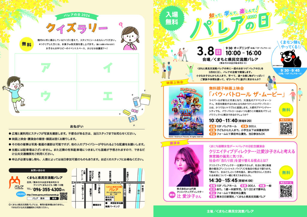 3月8日(日)は、くまもと県民交流館パレアの年に一度のおまつり「パレアの日」を開催します。